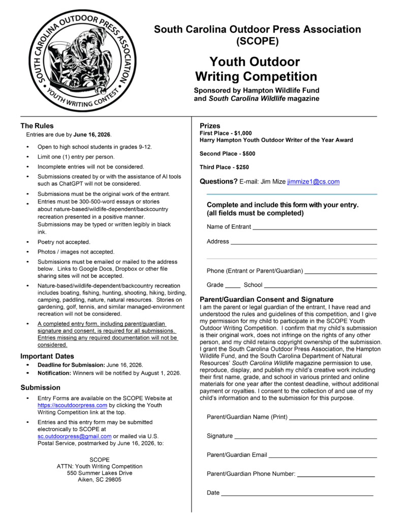The South Carolina Outdoor Press Association (SCOPE) is partnering with the Hampton Wildlife Fund and South Carolina Wildlife magazine to sponsor a South Carolina Youth Outdoor Writing Competition annually, beginning in 2025.
